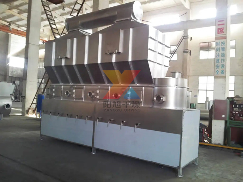 洁净的热风经阀板分配进入床体内,从加料器进入的湿物料被热风形成沸腾状态。由于热风与物料广泛接触,增强了传热传质的过程,因此在较短时间内就可干燥。如用连续型,物料从床体的一头进入,经过几十秒至几分钟沸腾干燥,自动从床体另一头流出。本设备一般进行负压操作。